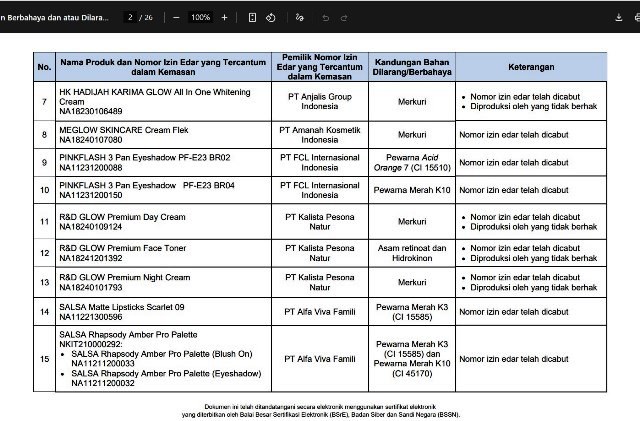 Dan dari ke-23 produk tersebut, dua nama merek yang cukup populer di Indonesia, Pinkflash dan SALSA Cosmetics. Dari kedua merek itu, ada beberapa produk yang dianggap berbahaya.