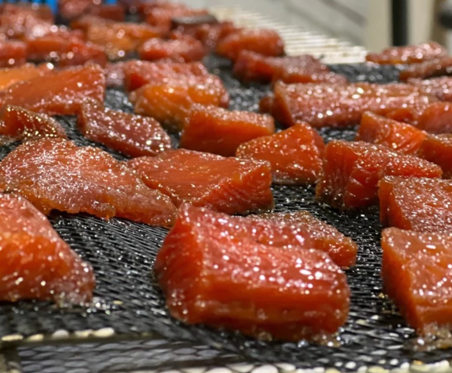 Tahap ini menjadi kunci dari pembuatan candied salmon, di mana pengasapan atau pengeringan, akan membuat tekstur salmon lebih padat sekaligus menjaga keawetannya.