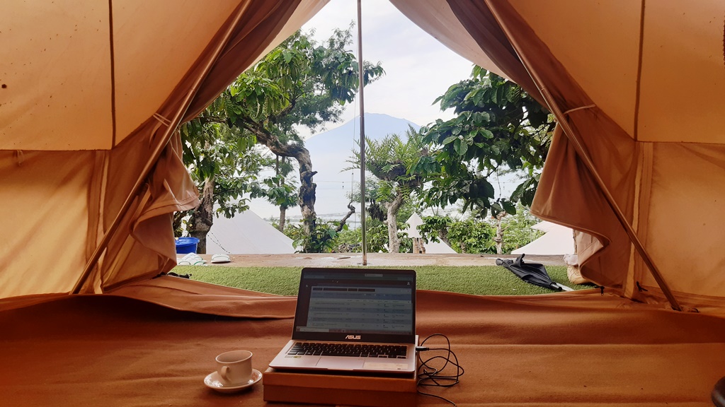 Yang tidak boleh dilewatkan adalah, momen ketika matahari terbit. Jika cuaca cerah atau kabut tak turun, maka kamu akan melihat jejeran pegunungan ketika kamu membuka tirai glampingnya. Ditambah kamu bakal menghirup udara segar, lantaran di sekeliling dihiasi pohon pinus.