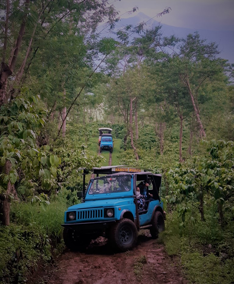 Dengan mengendarai jeep wisata, penyusuran jalur di tengah perkebunan kopi dimulai. Jalan aspal sempit mengular di sela tanaman kopi perlahan diterobos. Sayangnya ketika itu panen kopi sudah selesai, jadi tidak terlihat buah kopi yang merah ranum. Hanya pepohonan lindung lamtoro yang rimbun membuat suasana semakin sejuk.