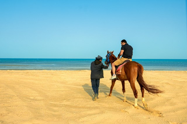 Di sini, para tamu bisa berkuda di atas pasir dengan laut biru zamrud di sisi mereka, sementara cahaya keemasan senja menyinari cakrawala.