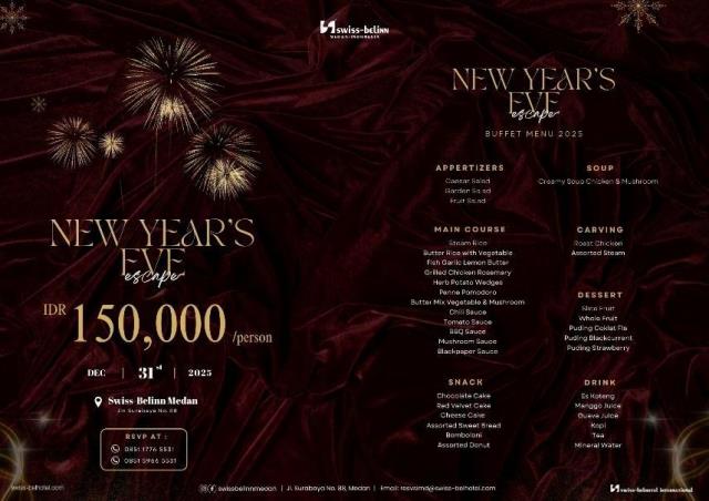 Bagi tamu yang ingin merayakan malam tahun baru tanpa menginap, Swiss-Belinn Medan juga menyediakan paket buffet dinner seharga IDR 150.000 net/pax. Tamu dapat menikmati hidangan buffet dengan berbagai pilihan menu yang disiapkan khusus untuk momen pergantian tahun, ideal untuk dinikmati bersama teman, keluarga, atau pasangan.