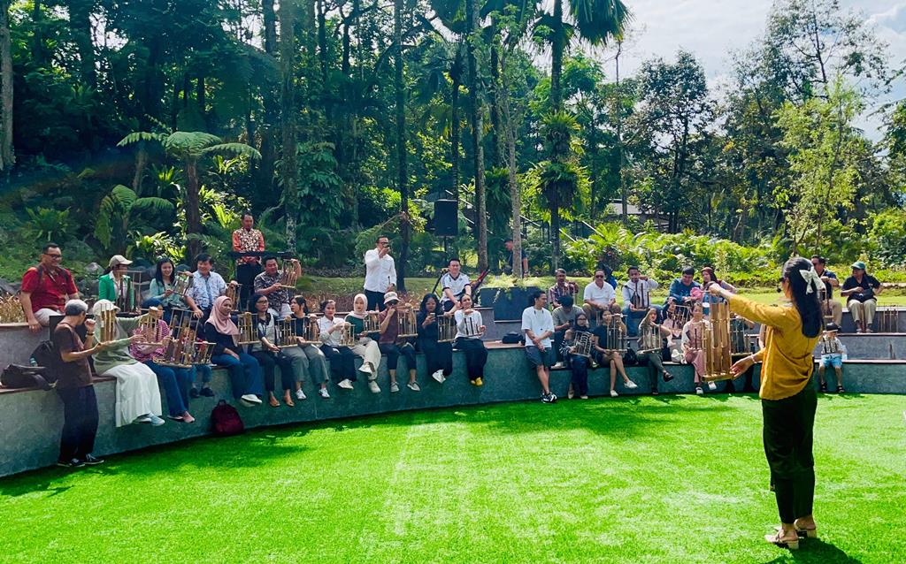 Dipandu Nia, para pengunjung bisa memainkan angklung dengan lagu lagu populer. Dok. A. Firdaus/Medcom