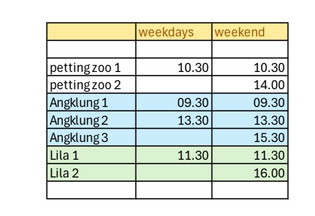 Saat weekday, Angklung show ini dimainkan setiap jam 09.30 pagi dan 13.30. Sementara untuk weekend dimainkan 3 kali sehari yaitu di jam 09.30 pagi, 13.30 siang, dan 15.30 sore.