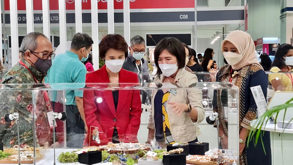 Singapura: Menteri Negara Perdagangan dan Industri Singapura Low Yen Ling terpesona melihat perhiasan karya pengrajin Indonesia. Perhiasan emas maupun perhiasan mutiara dari Lombok, Nusa Tenggara Barat ini dinilai sangat unik dan indah desainnya.