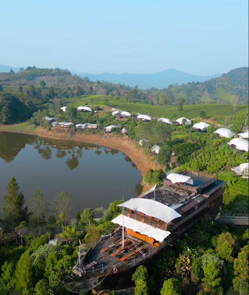 Destinasi glamping yang pertama adalah Rancabali Glamping. Bukan di gunung, Lakeside Rancabali memberikan pengalaman berkemah di pinggir danau, hutan, yang dikelilingi perkebunan teh.