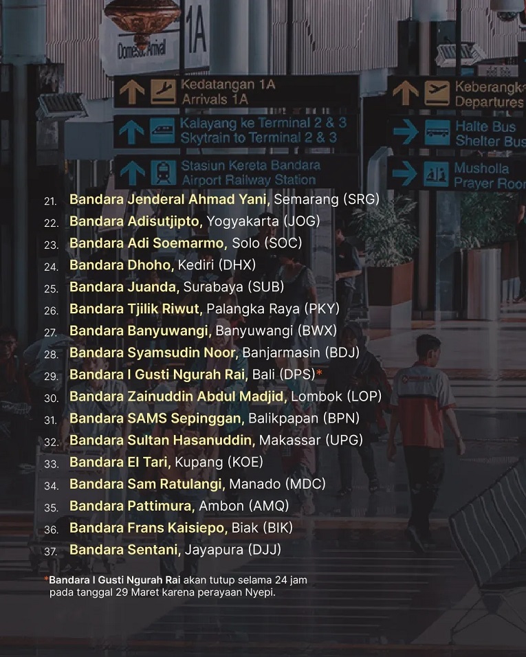 Sebaliknya kamu juga perlu ingat, untuk Bandara I Gusti Ngurah Rai akan tutup selama 24 jam khusus pada 29 Maret karena ada perayaan Hari Raya Nyepi. Nah berikut ini 37 Bandara yang akan beroperasi 24 jam selama periode Libur Lebaran melansir Kemenpar: