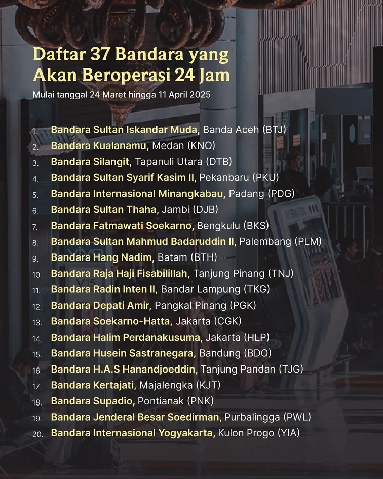 Seiring dengan itu, beberapa bandara yang ada di Indonesia juga menerapkan sistem pelayanan 24 jam. Terhitung pada periode Libur Lebaran sejak 24 Maret hingga 11 April 2025, 37 Bandara tersebut akan menemani perjalanan mudik dan libur lebaranmu.