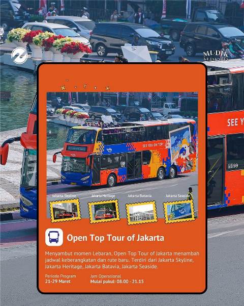 Menyambut momen Lebaran, program Open Top Tour of Jakarta menambah jadwal keberangkatan sekaligus menghadirkan beberapa rute baru, yaitu Jakarta Skyline, Jakarta Heritage, Jakarta Batavia, dan Jakarta Seaside. Program ini berlangsung pada 21–29 Maret 2026 dengan jam operasional mulai pukul 08.00–21.15 WIB.