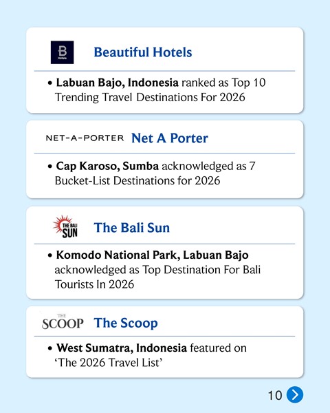 Sepanjang Januari 2026, pariwisata Indonesia tercatat meraih penghargaan dalam 32 kategori dari 25 organisasi dan lembaga internasional.