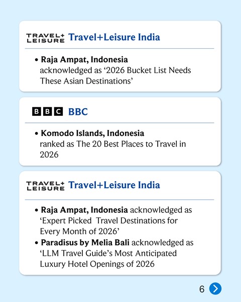 Selain destinasi, sejumlah hotel dan resor di Indonesia juga masuk dalam berbagai kategori penghargaan, mencerminkan peningkatan kualitas layanan dan pengalaman wisata yang semakin kompetitif di tingkat global.