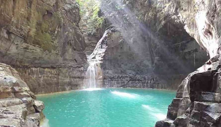 Dinding batu yang menjulang tinggi mengapit air terjun membuat pemandangan di sini sangat menakjubkan. Sayangnya, kendaraan roda empat hanya mampu mencapai jembatan gantung yang berjarak 2,5 km dari objek wisata ini.