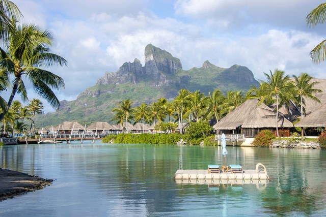 Pulau eksotis ini dulunya merupakan gunung berapi, yang kini berubah menjadi destinasi tropis yang menawan. Air lautnya jernih berwarna biru kehijauan, dilengkapi dengan vila-vila terapung yang ikonik. Pemandangan Gunung Otemanu yang menjulang di tengah pulau, menambah keindahan alamnya semakin sempurna.