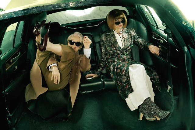Tata rambut dari Anna terlihat seperti bob berwarna kecoklatan yang terang. Pose tersenyum mengarah ke hadapan Meryl Streep. Sementara itu, Meryl Streep mengenakan kacamata hitam Prada dan jam tangan Cartier.