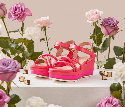 Sepatu wedges yang menggunakan bahan kulit di bagian uppers. Penggunaan strap Velcro® pada tali pergelangan untuk hook-and-loop-closure agar mudah dilepas-pasang. Warna pink pada sepatu memberikan kesan feminin dan kalem. Sepasang wedges ini dibanderol seharga Rp3.199.000.