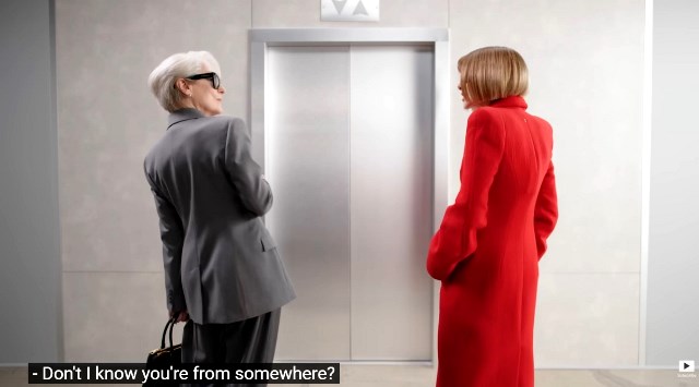 (Sebuah kata lucu disampaikan Miranda ke Anna di depan lift: "Do I know you're from somewhere?", sekan menanyakan kenapa mereka berdua mirip banget. Foto: Dok. Tangkapan layar YouTube Vouge)