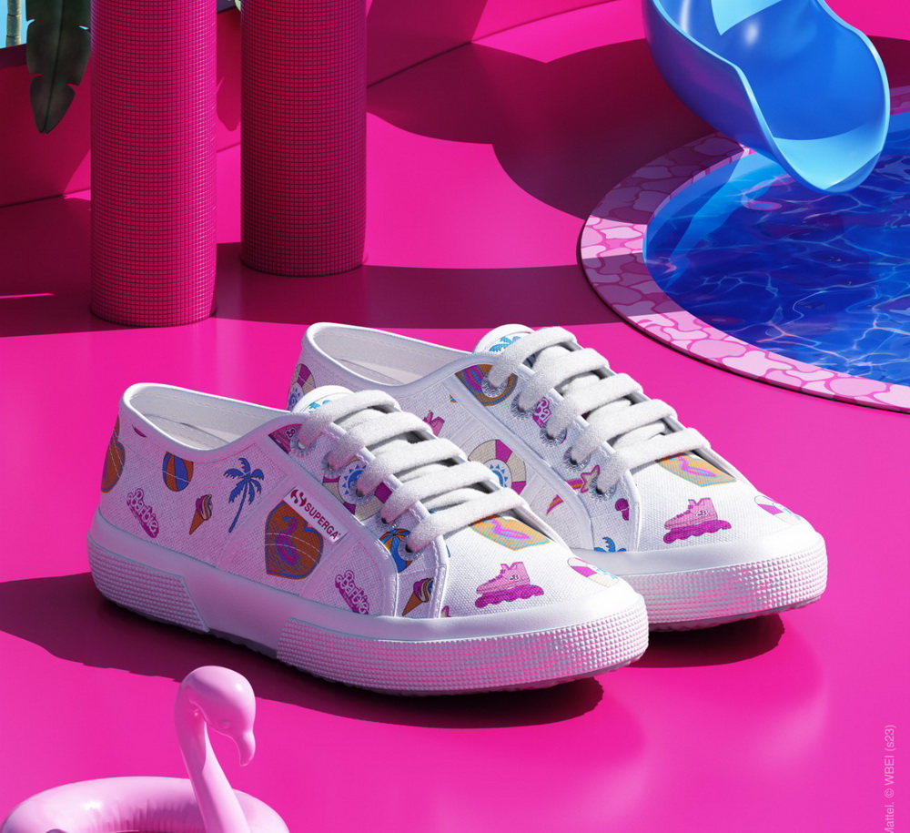 Koleksi legendaris Superga 2750 berbahan kanvas katun menampilkan motif khas musim panas yang terinspirasi dari Barbie seperti sepatu roda, mainan pantai, pohon palem, flamingo, es krim, bintang, hati, dan logo film dalam palet bertema merah muda.