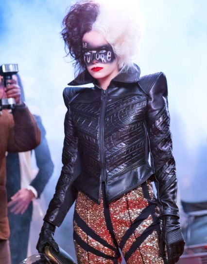 (Tampilan Estella saat menjadi Cruella memang sengaja dibuat lebih tajam agar ia terlihat sangat berbeda ketika balas dendam di pertunjukan pop-up. Foto: Dok. Disney)