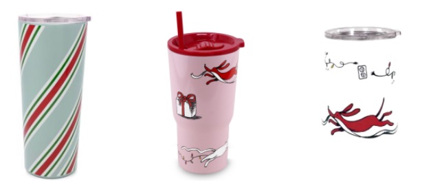 Stainless Steel Tumbler, Luna Stripe; Stainless Steel Tumbler, Holiday Party; dan Stainless Steel Wine, Holiday Party dari Kate Spade New York. Dok. Ist