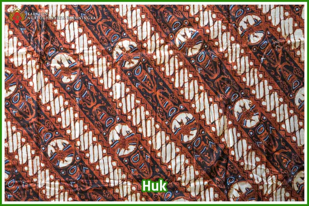 Motif Huk hanya boleh dikenakan oleh raja dan putra mahkota. Motif ini terdiri dari motif kerang, binatang, tumbuhan, cakra, burung, sawat (sayap), dan garuda. Motif kerang bermakna kelapangan hati, binatang menggambarkan watak sentosa, tumbuhan melambangkan kemakmuran, sedangkan sawat ketabahan hati.