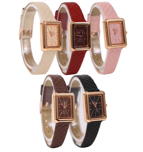 Case stainless steel-nya berwarna rose gold sehingga terkesan mewah. Dikombinasikan dengan strap kulit sintetis yang memberikan kesan elegan. Tersedia dalam lima pilihan warna klasik yang fleksibel dipadukan bersama warna lain. Case persegi panjangnya berukuran 2 cm x 2,6 cm, cocok untuk wanita berlengan kecil. Harga Rp265 ribuan.