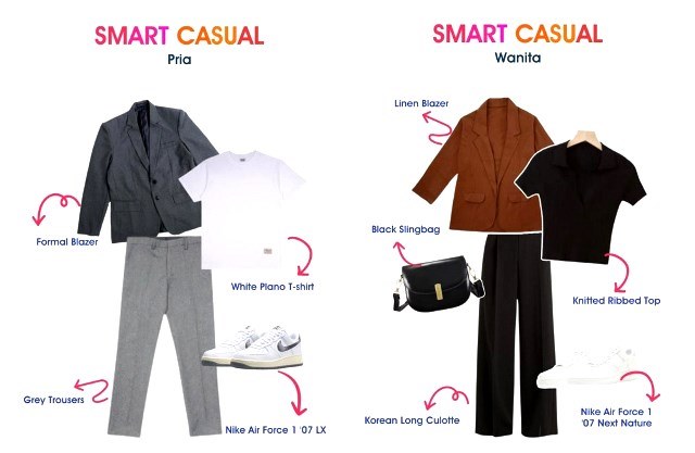 Untuk pria, dapat memadukan celana panjang chino atau bahan dengan kaos polos yang dibalut dengan blazer warna abu, dan lengkapi tampilan dengan Nike Air Force 1 warna putih beraksen grey.