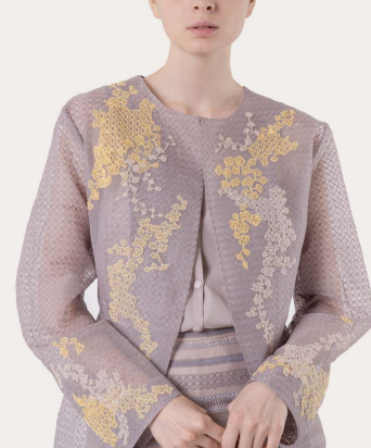 Merupakan percampuran detail motif dari SAPTO DJOJOKARTIKO yang diperkenalkan pada koleksi Raya 2021 dengan keistimewaan inspirasi bunga melati dan sangkar Indonesia pada sulaman.(Foto: Dok. Sapto Djojokartiko)