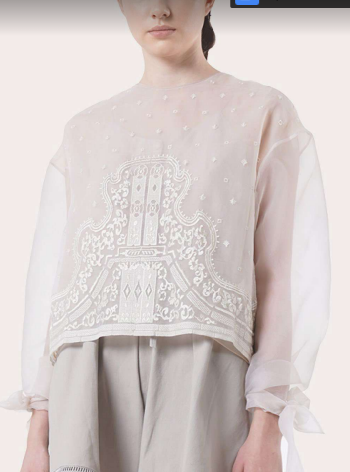 Merupakan detail motif yang diperkenalkan pada pagelaran show tunggal pertama SAPTODJOJOKARTIKO untuk koleksi Spring/Summer 2019. Motif ini terinspirasi dari warisan Asia Tenggara dan journey of human culture menuju modernity, berupa architecural lines dari pagoda bercampur dengan circuit panel sebuah mesin menjadi inspirasi pada sulaman.(Foto: Dok. Sapto Djojokartiko)