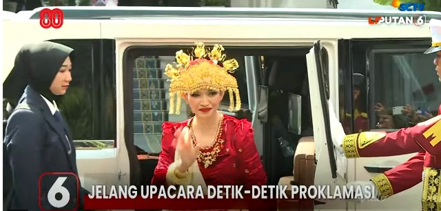 (Selvi Ananda, tampak cantik mendampingi sang suami, mengenakan pakaian adat Palembang di HUT ke-80 RI. Foto: Dok. Tangkapan layar YouTube Liputan 6/SCTV)