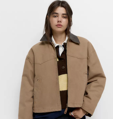 Jaket dengan kerah kombinasi ini terbuat dari bahan kulit imitasi, dengan detail pas bahu, saku samping, dan ritsleting. Bagian luatnya 100 persen katun dengan lapisan 100 persen poliester. Harga Rp799.900