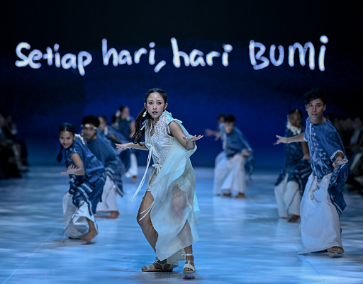 (Dita Karang menari dengan mengenakan koleksi “Larung” Sejauh Mata Memandang. Foto: Dok. Istimewa)