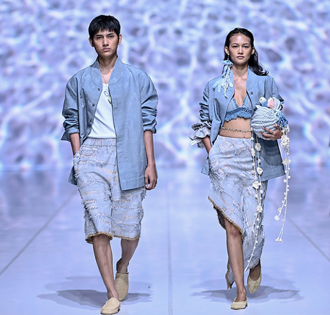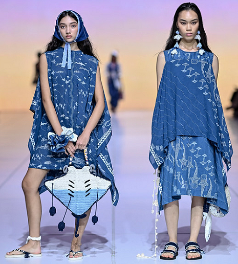 Warna biru mendominasi koleksi “Larung” sebagai representasi laut, berpadu dengan warna putih yang melambangkan kesucian dan awal yang baru, namun juga menjadi pengingat akan warna karang yang memutih akibat rusaknya ekosistem laut.