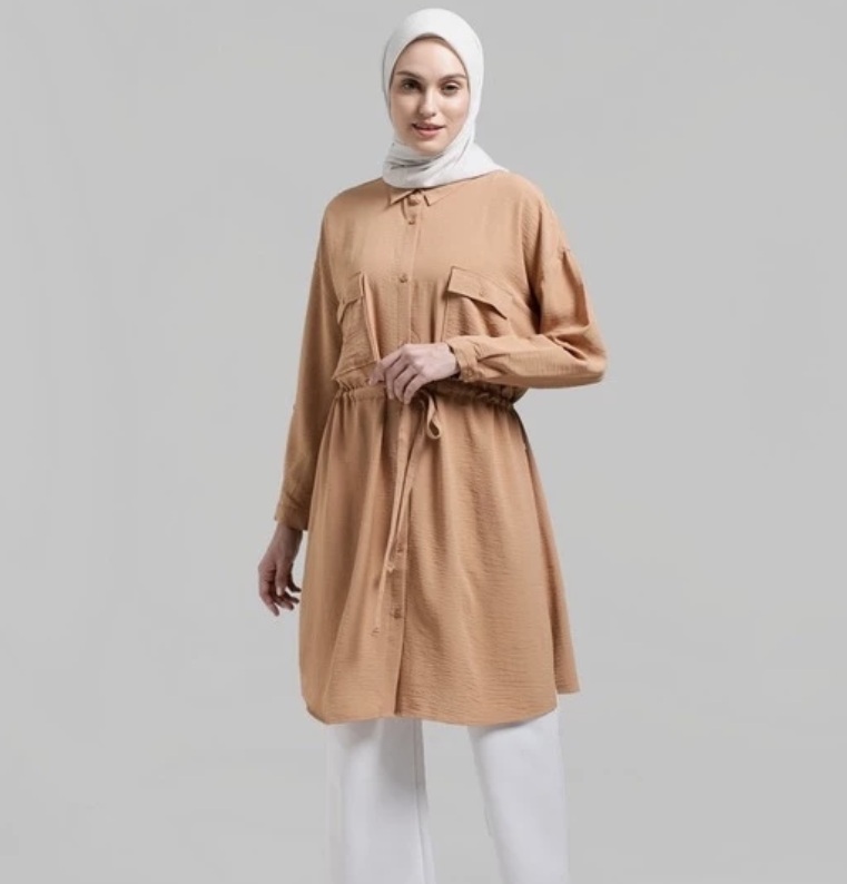 Warna coklat pada tunik ini memberikan kesan hangat sekaligus elegan, sehingga mudah dipadukan dengan berbagai warna hijab. Modelnya yang simpel membuat tunik ini cocok, digunakan untuk berbagai aktivitas sehari-hari.