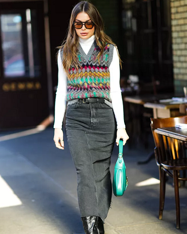 Untuk kamu yang senang dengan gaya outfit tahun 90-an, tentu akan merasa nyaman dengan potongan khas ini. Atasan kaos turtleneck lengan panjang berbahan tipis dan bawahan rok maxi denim, sangat cocok dipadukan dengan vest rajut bermotif sebagai outernya. Outfit ini bisa membuatmu ramping sekaligus menambah kehangatan saat cuaca dingin tentunya.