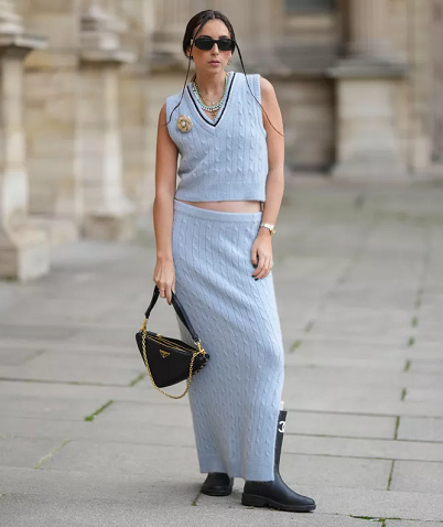 Jangan takut, tren one set yang serasi tidak mengecualikan rompi sweater. Pasangkan outfit rajutan serasi favoritmu dengan aksesori yang menonjol seperti perhiasan dan sepatu bot tinggi. Jadi, walaupun hujan, penampilanmu tetap memukau!