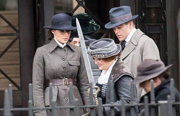 Tampak Gal Gadot dan Chris Pine tampil elegan dengan jaket abu-abu, kemeja, beserta topi fedora.