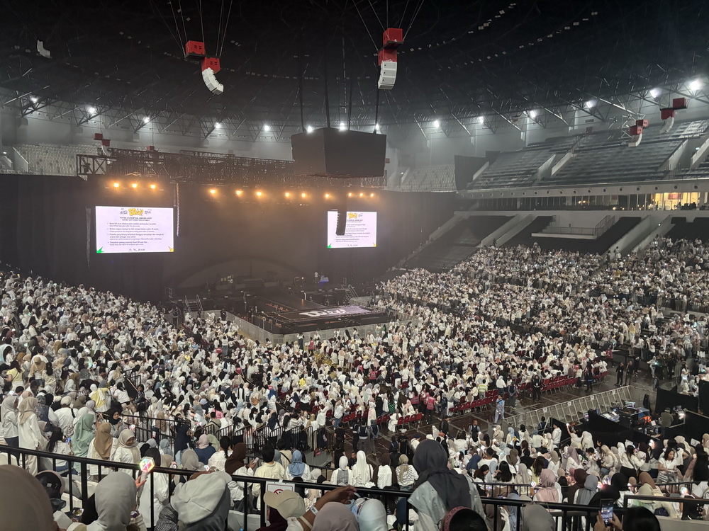 Warna putih ini menjadi simbol kekompakan dan kebersamaan para penggemar dalam mendukung sang idola. Mereka terlihat saling berinteraksi dan bersemangat menunggu konser dimulai, menciptakan energi positif yang terasa hingga ke panggung utama.