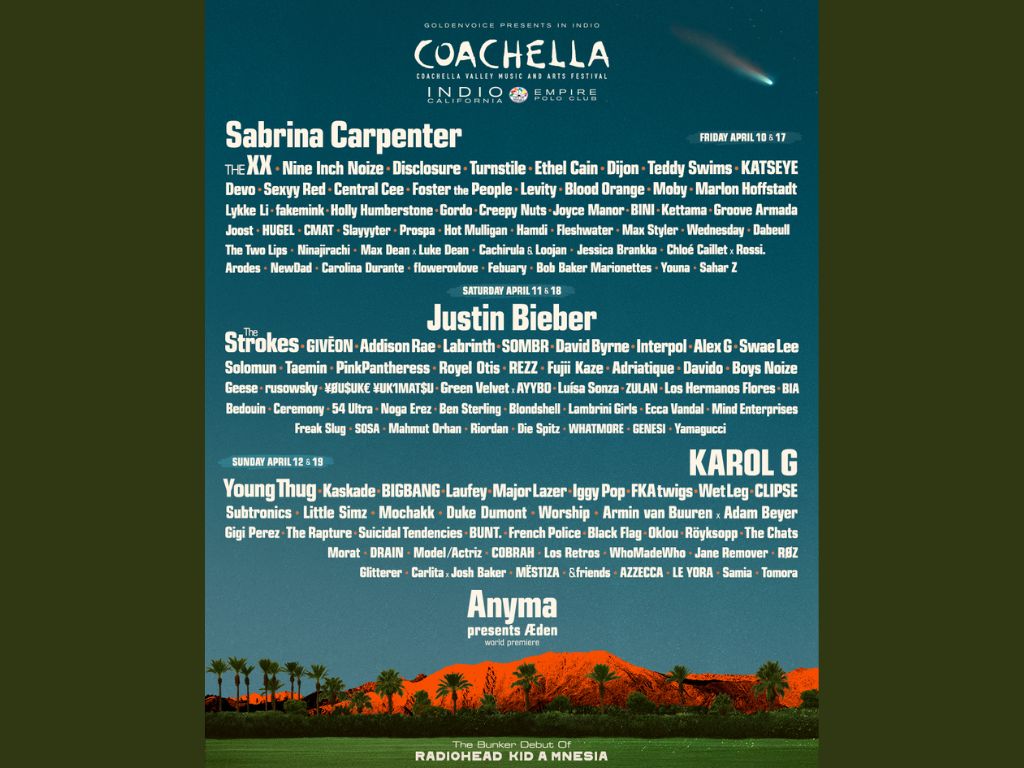 Sabrina Carpenter, Justin Bieber, dan Karol G telah diumumkan sebagai headliner utama. Karol G mencetak sejarah sebagai artis Latina pertama yang tampil sebagai penampil utama di festival ini.