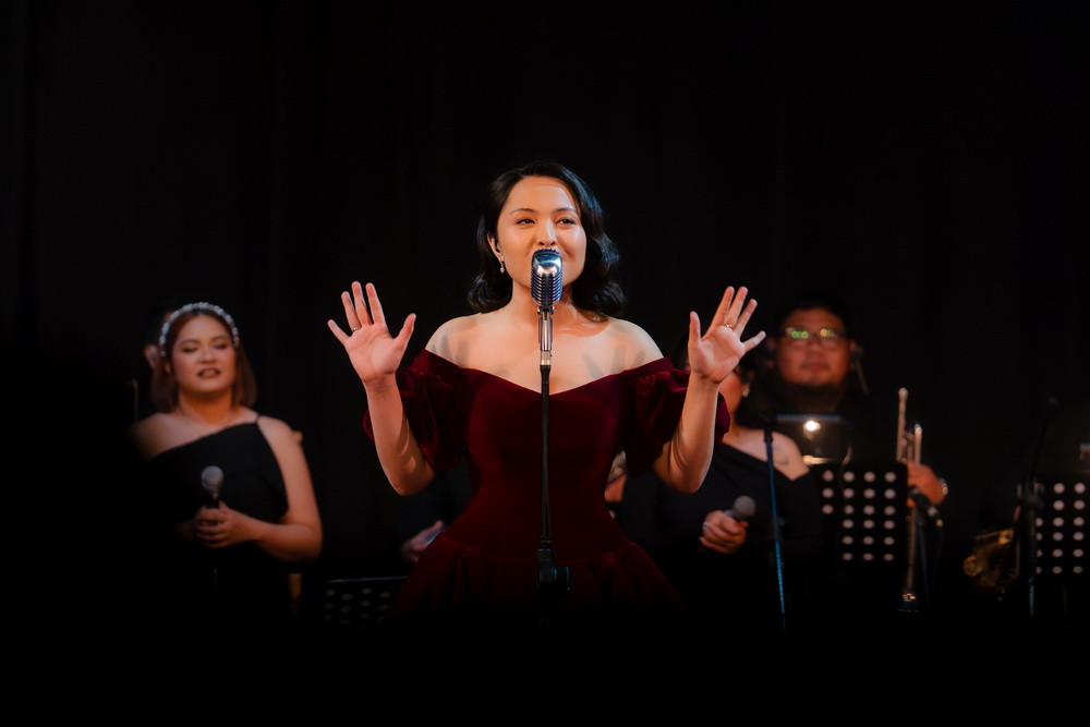 Penonton yang sedang menikmati alunan musik itu secara tiba-tiba bersorak usai melihat Bernadya yang muncul dari bawah panggung. Ia memakai gauan berwarna merah tua yang mempercantik penampilannya malam ini.