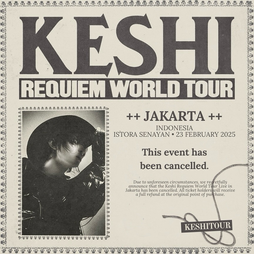 "Karena keadaan yang tak terduga, dengan menyesal kami mengumumkan bahwa Konser Keshi Requiem World Tour Live di Jakarta dibatalkan. Semua pemegang tiket akan menerima pengembalian dana penuh di tempat pembelian tiket semula," keterangan dalam poster yang dibagikan akun Instagram @keshitour.