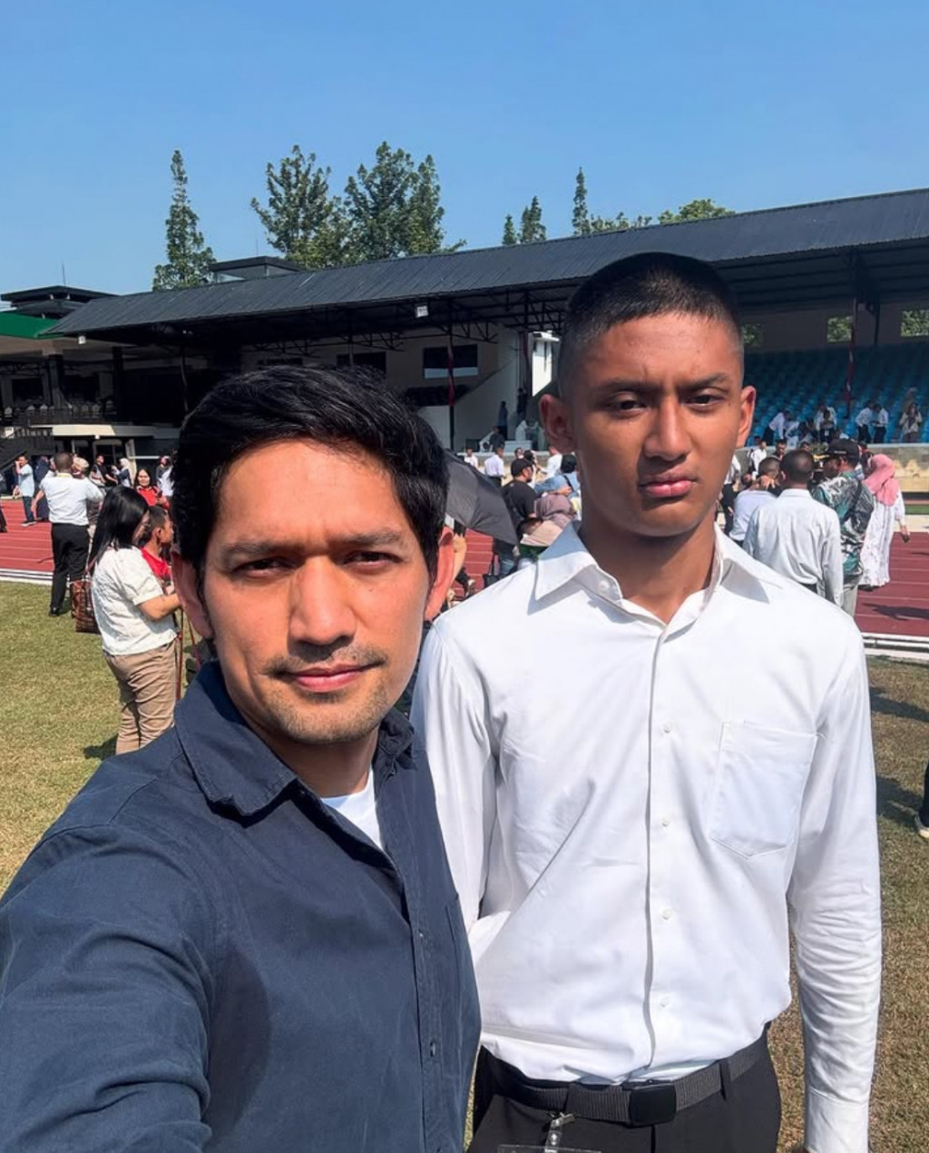 Momen paling menyentuh terjadi saat aktor berusia 44 tahun itu berlari mencari sang anak di antara barisan taruna, lalu memeluknya erat dengan mata berkaca-kaca.