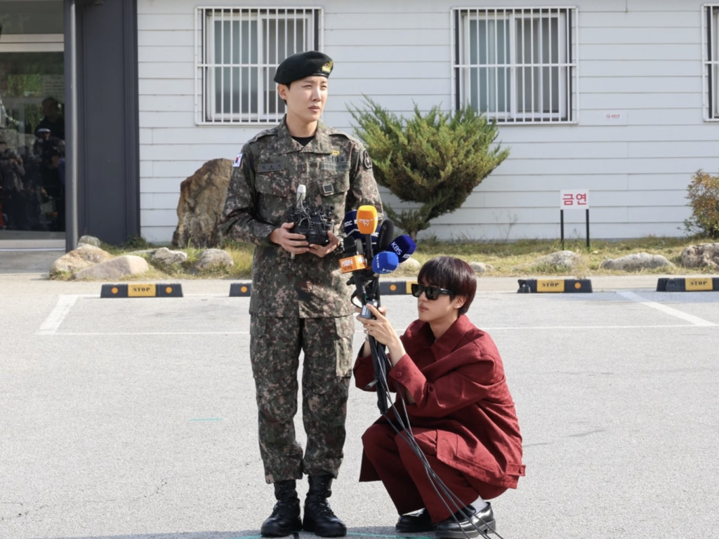Keluarnya J-Hope dari masa wamil mendapatkan sambutan hangat dari rekannya Jin yang juga merupakan member dari boygrup BTS. Jin membantu memegangi mikrofon untuk J-Hope selama konferensi pers dengan media berlangsung.