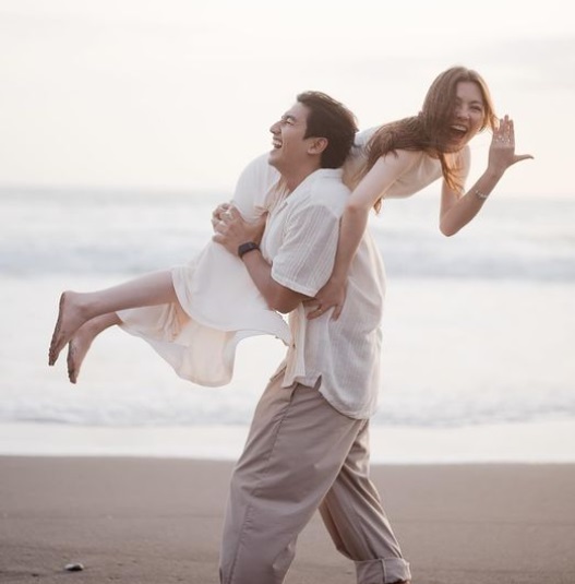 Pemandangan indah pantai Bali dengan deburan ombak semakin menambah suasana romantis saat lamaran tersebut.