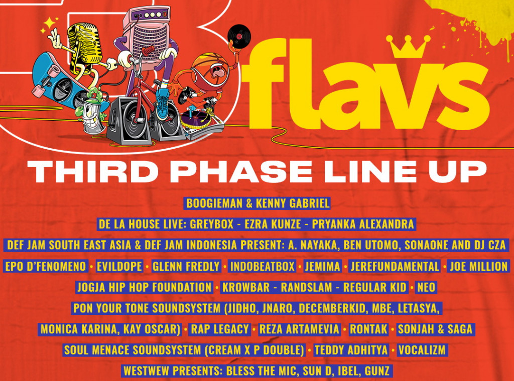 Sebelumnya, Flavs telah mengumumkan sejumlah nama yakni Adrian Khalif, Boyz Got No Brain, Brown Sugar, Dekat, D.P.M.B, Eyefeelsix, Fade 2 Black, Gamaliel, Goldvoice, Imaniar, Iwa K, Jamie Aditya, Laze, Maliq & D'Essentials. Marcell, Mario Zwinkle, Matter Moss, Mukarakat, Preachja Crew, Ramengvrl, Ras Muhamad, Rinni Wulandari, Sade Susanto, Saykoji, Teza Sumendra, T-Five, Tuan Tigabelas, dan Yura Yunita juga tampil.