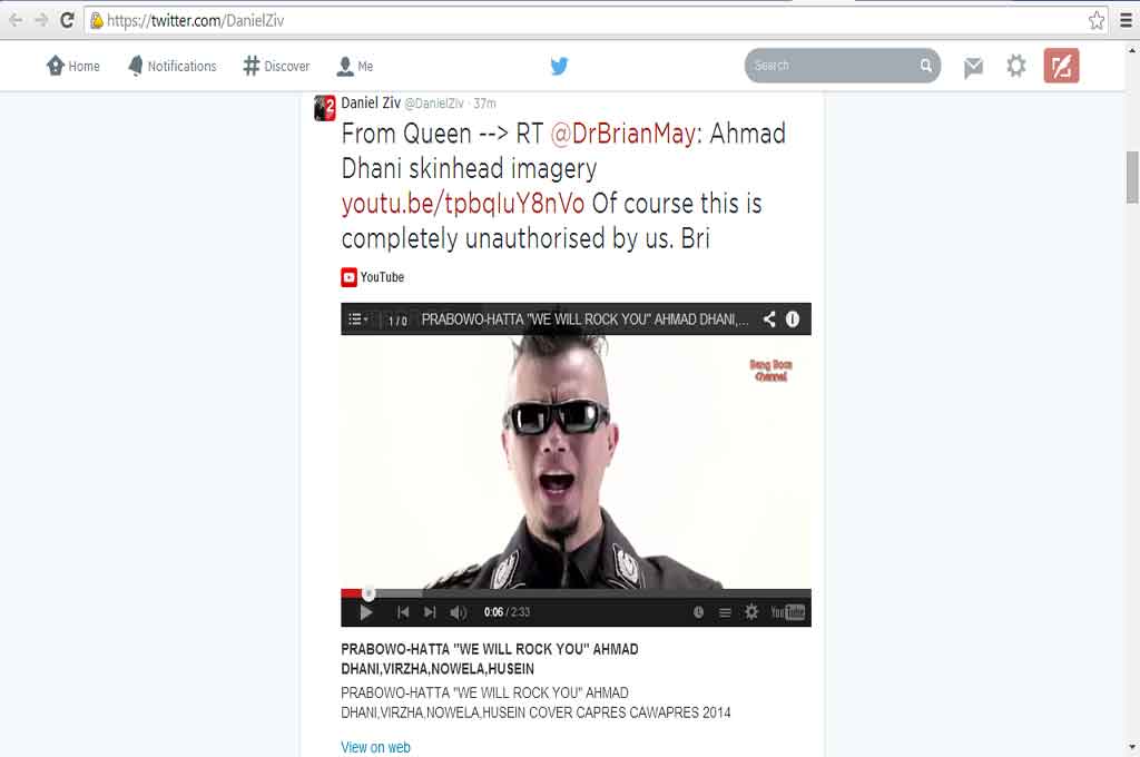 "Ahmad Dhani skinhead imagery (merujuk tautan video 'We Will Rock You' versi Ahmad Dhani, Red) Of course this is completely unauthorised by us," tulis May.