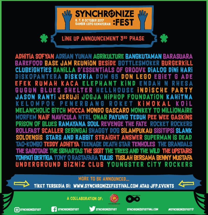 Synchronize Festival akan digelar pada 6, 7, dan 8 Oktober 2017 di Gambir Expo Kemayoran, Jakarta. Ini adalah tahun kedua Synchronize Festival digelar. Rencananya, lebih dari 100 penampil akan terlibat pada tahun ini.