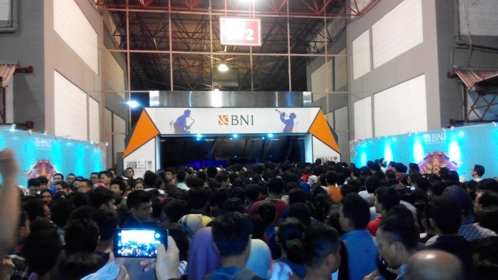 Antrian panjang tak teratur sudah terlihat sejak pukul 18.00 WIB. Para penonton berdesakkan. Ruangan pun terasa penuh, padahal masih banyak penonton yang mengantri.