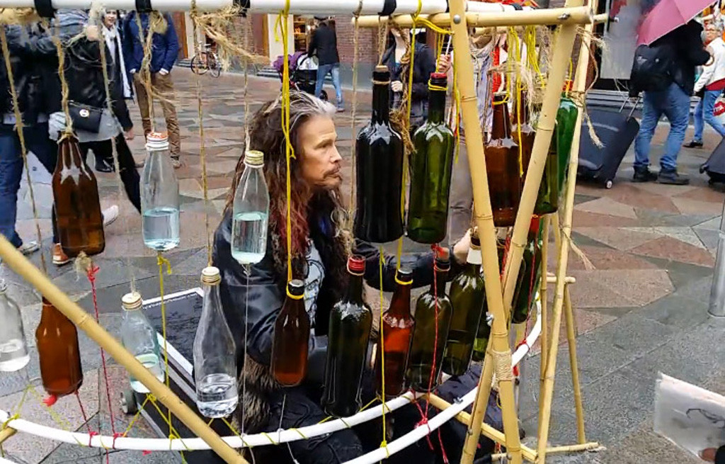 Tyler memainkan xilofon botol gelas, sejenis gambang yang dibuat dari bambu, kayu, dan sekitar 20 botol anggur milik musisi jalanan asal Rusia Fedor Grigorev, yang rutin beraksi di pusat kota Helsinki.