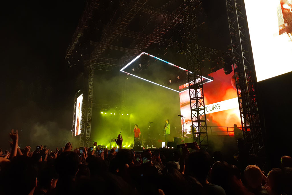 Selesai menuntaskan lagu pertama, panggung mendadak dipenuhi stimulus visual berwarna-warni dengan mayoritas warna kuning. Tanpa basa-basi, sang vokalis Matthew Healy mulai menyanyikan lagu terbaru mereka berjudul People.