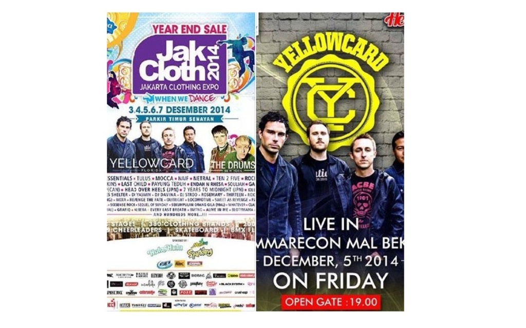 "Hello Indonesia! Finally, we will be performing at Jakcloth on December 3 and in Bekasi on December 5! See you there!" tulis Yellowcard dalam akun resmi Facebook.